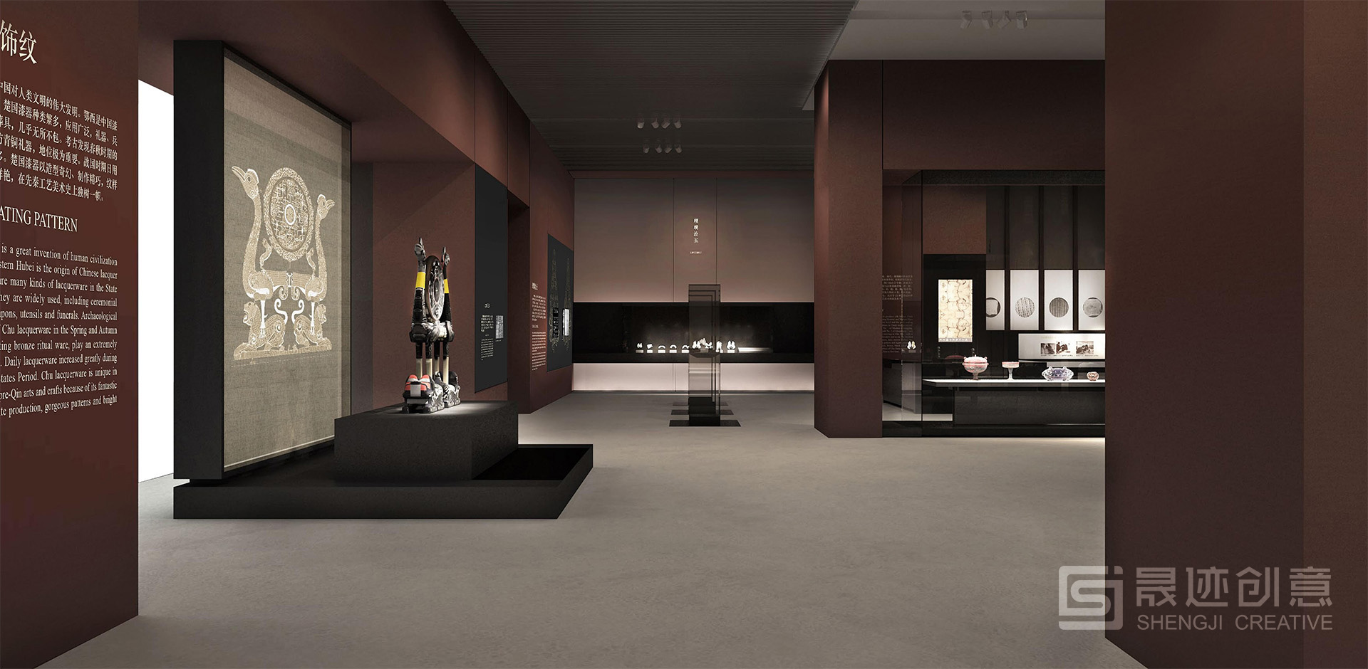 湖北省博物馆“楚国八百年”陈列展览主题为“辉煌灿烂的楚文化”,在设计上突出楚风楚韵,以楚国漆器常见的红色为主色调。序厅的大型浮雕以最具特色的楚国文物——虎座鸟架鼓为主要元素。展厅风格既体现了楚国历史的厚重,又凸显了艺术的丰富绚丽。 展览主体分为四个部分:开疆拓土、礼俗百业、文思妙理、精彩绝艳。设计上突出楚风楚韵,以楚国漆器常见的红色为主色调。