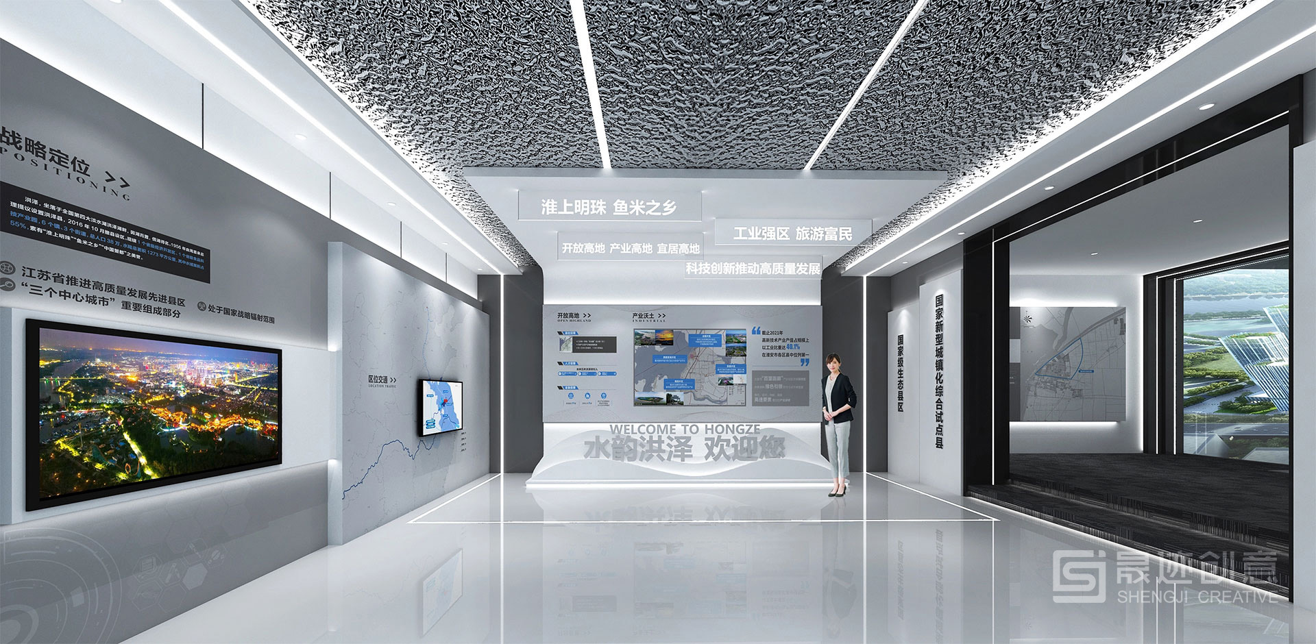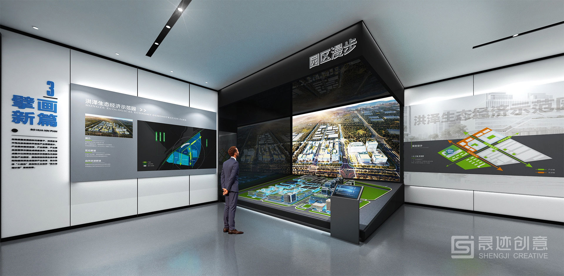 洪泽产业园规划展览馆以数字展示为主要手段,以高科技展示为亮点,将传统展示方式与声、光、电等现代科技手段相结合,通过直观生动的展示手段,使规划成果更加生动形象、深入浅出。